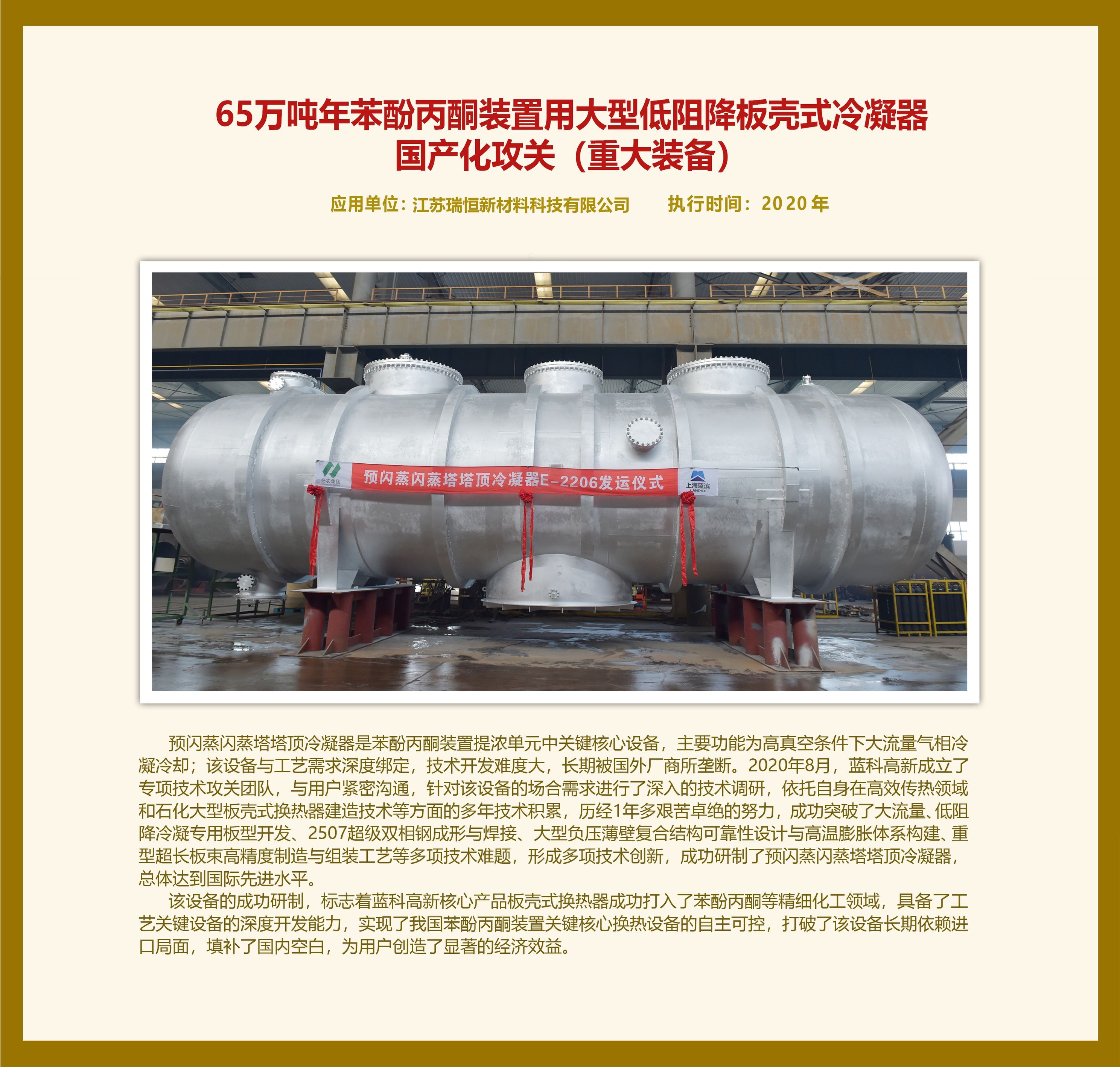 65萬噸年苯酚丙酮裝置用大型低阻降板殼式冷凝器 國產(chǎn)化攻關(guān)(重大裝備)